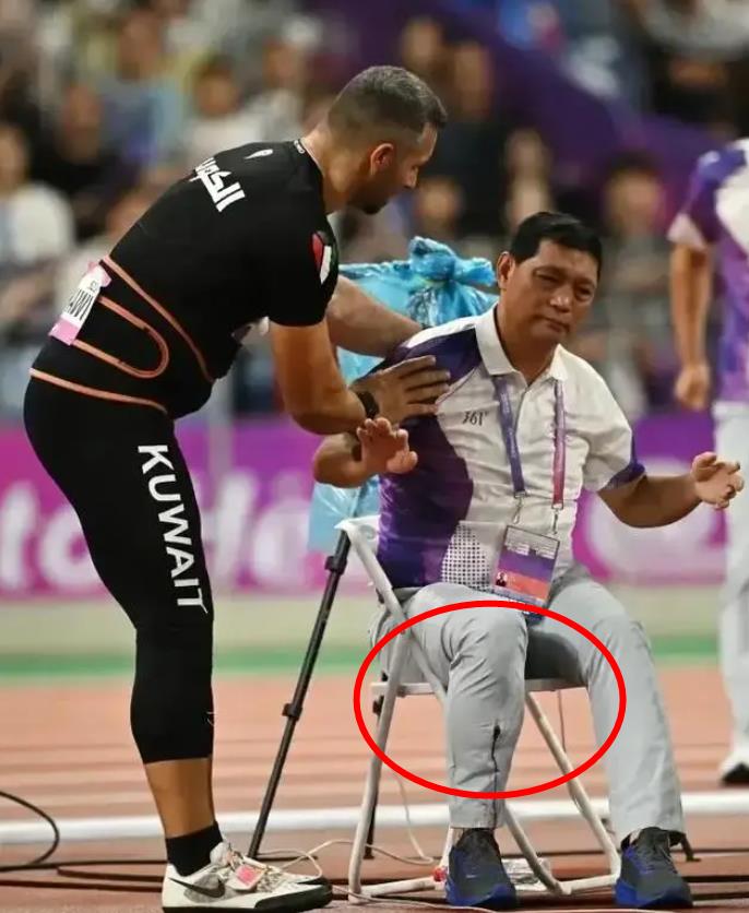 这是啥情况呢?根据视频显示,穆罕穆德在投掷的过程中,脚下出现了打滑,失去平衡的穆罕穆德将链球直接砸向了场边的裁判席,而坐在椅子上的62岁裁判根本来不及闪躲。穆罕穆德这一下有多狠呢?链球直接把裁判裤子砸破,裁判小腿也是直接出血,大腿瞬间肿胀,随后,医务人员也是紧急的将62岁的裁判送往就医。