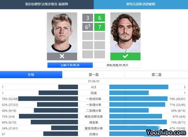 第一盘比赛,西西帕斯尽管在第3局先被破发,不过达维多维奇-福基纳不会打领先球的弱点很快暴露出来,西西帕斯在第4局和第8局两次成功破发后,以LoveGame强势拿下自己的发球胜盘局,并因此以6-3先赢一盘。