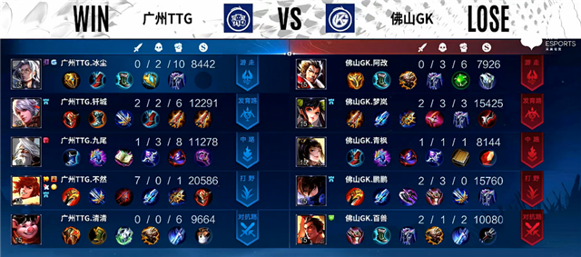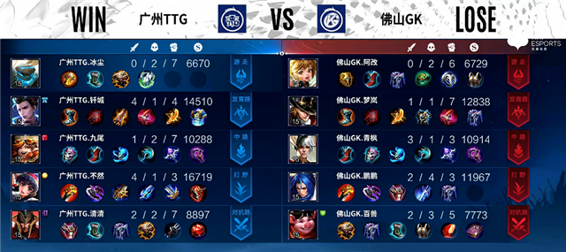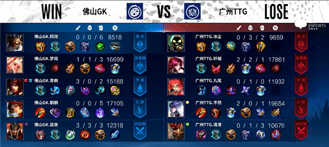 2分20秒暴君团,虞姬拿下一血,镜拿下暴君。5分钟马超推掉下路一塔。5分25秒野区团战,广州TTG打出0换2。6分40秒河道团战,佛山GK打出1换3。7分12秒广州TTG中路一塔被破。8分钟镜拿下暴君。9分20秒野区团战,佛山GK打出2换3。10分20秒镜拿下暴君。11分10秒镜拿下主宰。12分30秒高地团,东皇太一被击杀,虞姬推掉上路高地塔。13分20秒虞姬推掉中路高地塔,马超被击杀。14分12秒镜拿下暴君。15分45秒佛山GK推掉水晶率先拿下赛点。