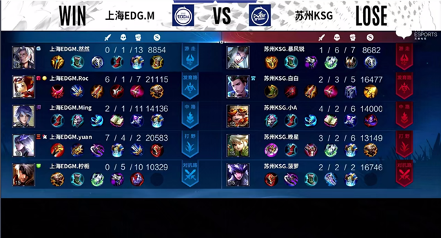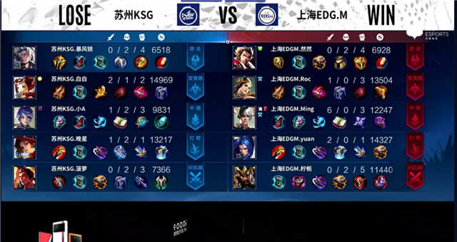 2分11秒,上海EDG.M控下暴君。3分16秒,中路团,苏州KSG打出一换二。3分40秒。苏州KSG控下先知主宰。4分38秒,苏州KSG破掉上海EDG.M下一塔。5分11秒,上海EDG.M破掉苏州KSG下一塔。5分28秒,中路团,双方1换1。6分13秒,苏州KSG击杀镜。6分28秒,上路团,苏州KSG打出0换3。7分05秒,苏州KSG控下暴君。8分36秒,苏州KSG控下主宰。10分02秒,中路团,双方1换1。10分35秒,上海EDG.M破掉苏州KSG上一塔。10分38秒,苏州KSG控下暗影暴君。11分30秒,苏州KSG破掉上海EDG.M中一塔。11分50秒,苏州KSG野区击杀夏侯惇。12分15秒,苏州KSG先后破掉上海EDG.M中上二塔。12分40秒,苏州KSG控下暗影主宰。13分25秒,苏州KSG破掉上海EDG.M下二塔。13分40秒,双方下路一换一,随后苏州KSG破掉上海EDG.M下路高地。14分53秒,上海EDG.M控下暗影暴君,随后双方打出1换1。16分50秒,苏州KSG控下暗影主宰。20分25秒,双方团,上海EDG.M打出2换3。21分10秒,上海EDG.M击杀阿古朵。21分41秒,上海EDG.M控下风暴龙王。22分23秒,上海EDG.M破掉苏州KSG中一塔,随后破掉上二塔。23分52秒,上海EDG.M破掉苏州KSG中二塔。25分11秒,中路团,上海EDG.M打出0换5团灭苏州KSG,随后中路一波摧毁水晶拿下第一小局的胜利。