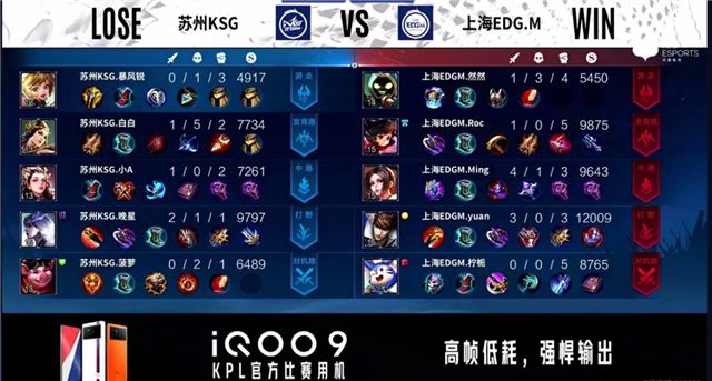 2分14秒,苏州KSG控下暴君,随后击杀不知火舞拿下一血。3分59秒,上海EDG.M控下先知主宰。5分14秒,苏州KSG击杀太乙真人6分20秒,下路团,上海EDG.M击杀虞姬,随后控下暴君。7分03秒,上海EDG.M击杀虞姬。7分23秒,上海EDG.M先后破掉苏州KSG上一塔和上二塔。8分20秒,上海EDG.M控下主宰。9分10秒,上海EDG.M破掉苏州KSG下二塔。9分30秒,野区团,上海EDG.M打出1换2。9分50秒,上海EDG.M破掉苏州KSG下路高地,随后破掉苏州KSG中一塔。11分19秒,上海EDG.M破掉苏州KSG中二塔。13分04秒,上海EDG.M不知火舞击杀虞姬,随后团战0换3一鼓作气摧毁水晶赢得了比赛的胜利。