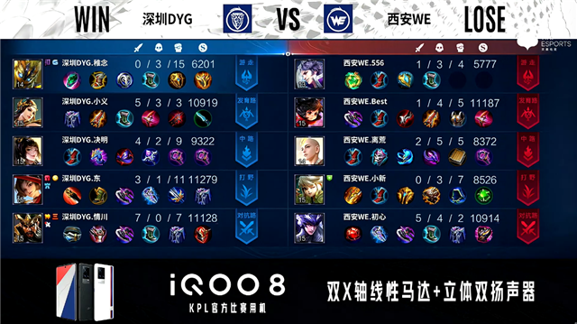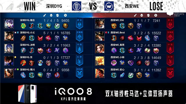 双方常规开局。2分59秒西安WE拿下暴君。3分05秒野区团战双方1换1,深圳DYG拿到一血。7分58秒深圳DYG拿下暴君。9分42秒深圳DYG拿下主宰。10分51秒深圳DYG拿下暗影暴君。12分整深圳DYG摧毁敌方对抗路二塔。12分24秒深圳DYG摧毁敌方发育路二塔。12分42秒西安WE拿下暗影主宰。13分43秒中路团战西安WE打出1换2。14分34秒西安WE摧毁敌方中路外塔。15分05秒深圳DYG中路击杀白起。15分42秒深圳DYG击杀周瑜并拿下暗影暴君。15分58秒深圳DYG摧毁敌方中路外塔。17分14秒深圳DYG拿下暗影主宰。17分48秒深圳DYG摧毁敌方中路二塔。19分54秒西安WE中路击杀沈梦溪。20分26秒西安WE拿下风暴龙王,深圳DYG摧毁敌方对抗路高地塔。20分54秒西安WE对抗路击杀马超。20分03秒团战西安WE击杀太乙真人并摧毁敌方对抗路高地塔。22分47秒西安WE摧毁敌方中路高地塔。24分15秒中路团战西安WE打出0换4。24分33秒西安WE摧毁敌方水晶拿下比赛。