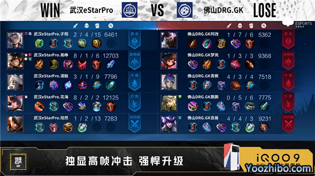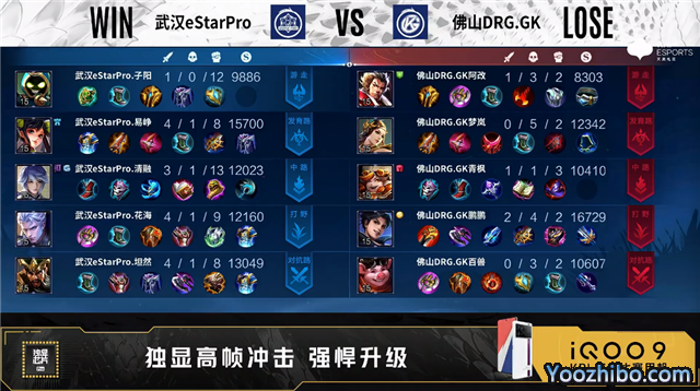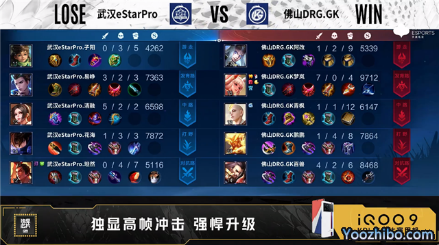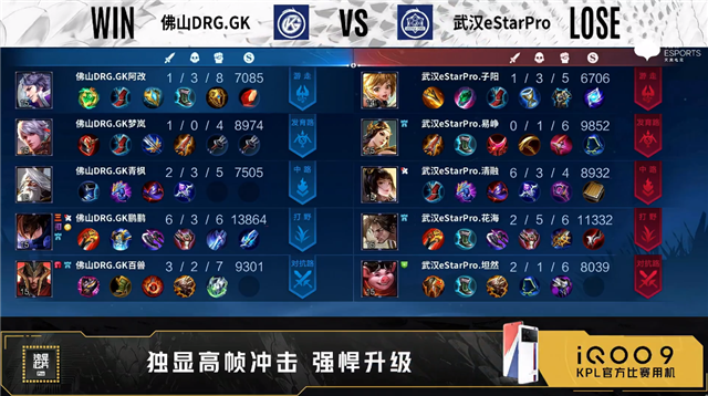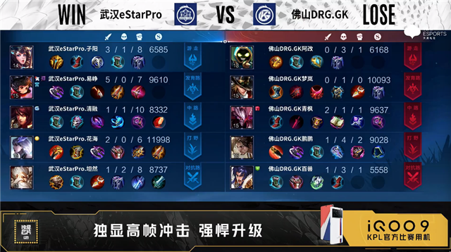 开局佛山DRG.GK三人中路抢线。3分04秒武汉eStar拿下暴君。4分15秒野区团战武汉eStar打出1换2,武汉eStar澜拿到第一滴血。5分49秒武汉eStar对抗路打出1换2。7分40秒双方对抗路3换3。9分50佛山DRG.GK摧毁敌方对抗路二塔。10分29秒主宰处团战佛山DRG.GK打出0换3。11分43秒佛山DRG.GK强点水晶拿下比赛。