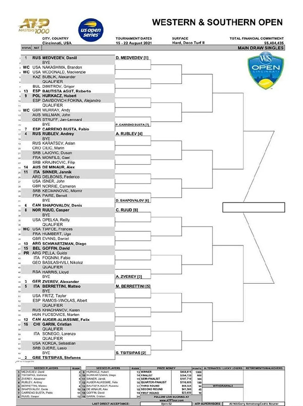 24直播网讯 罗杰斯杯将于明天决出最终的冠军,而马上接档而至的辛辛那提大师赛也于昨日公布了男单正赛签表。