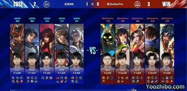 决胜局,北京WB蓝色方,拿到了曜+莱西奥。武汉eStar红色方,拿到了澜+孙尚香。开局武汉eStar击杀周瑜,拿下一血。10分钟,武汉eStar直推中路一塔,经济差拉开七千。决胜团,武汉eStar一波零换四,直推水晶,拿下最终胜利。
