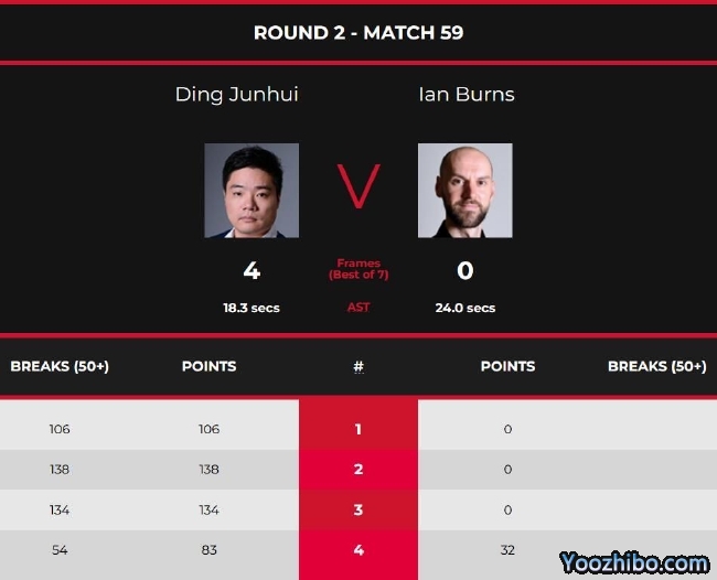 24直播网 10月27日,2022年世界斯诺克巡回赛英格兰公开赛继续展开资格赛争夺,在一场焦点战中,中国名将丁俊晖对决英格兰选手伯恩斯。全场比赛中,丁俊晖手感火热,进攻准度相当之高,前三局连续打出3杆破百,最终以连下四局,大比分4-0横扫对手,强势挺进正赛64强。