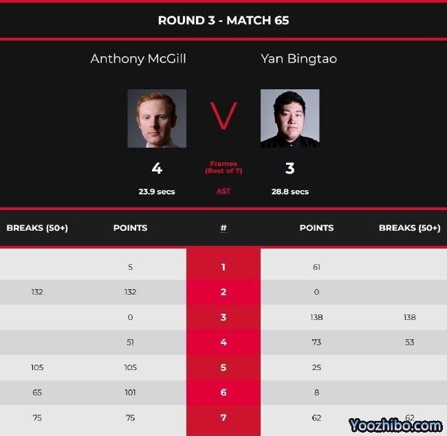 第一局颜丙涛先以61比5顺利拿下,第二局麦克吉尔轰出单杆132分,扳平大比分。从第三局开始,颜丙涛还以颜色,先是击出单杆138分以大比分2比1领先,其后第四局打出单杆53分,以大比分3比1拿到赛点。