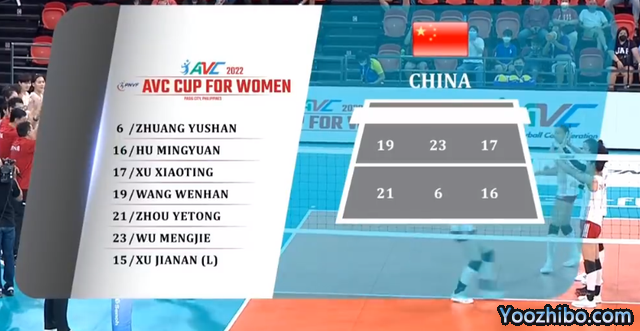 中国女排首发阵容:主攻:庄宇珊、吴梦洁、副攻:胡铭媛、王文涵、二传:许晓婷、接应:周页彤自由人:许嘉楠