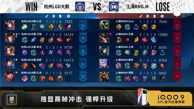 第五局,杭州LGD大鹅选出铠加关羽双刺客,上海RNG.M则选出了马超阿古朵体系,开局6分钟,中路一波团战,上海RNG.M2换3,打散了杭州LGD大鹅,顺势拿下中路一塔。随后的团战,上海RNG.M与杭州LGD大鹅势均力敌,并未建立起优势。13分钟,迎来转折点,上海RNG.M在暗影暴君处,0换2,顺势推掉对方中路二塔,拿下暗影暴君。此时,局势逐渐向上海RNG.M有利。最终,上海RNG.M凭借一波1换4的团战,推掉了杭州LGD大鹅水晶,拿下了比赛胜利。