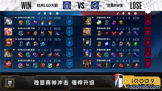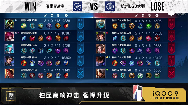 第一局开局双方互换蓝Buff。3分36秒济南RW侠拿下先知主宰。4分30秒杭州LGD大鹅对抗路击杀蒙恬拿下一血。4分47秒济南RW侠摧毁敌方发育路外塔。5分10秒济南RW侠拿下暴君。5分15秒中路团杭州LGD大鹅击杀桑启。5分45秒双方互换边路外塔。5分59秒杭州LGD大鹅对抗路击杀橘右京。6分25秒杭州LGD大鹅摧毁敌方发育路二塔。7分15秒中路团杭州LGD打出0换4,沈梦溪拿下三连决胜。7分48秒杭州LGD大鹅摧毁敌方中路外塔。9分02秒杭州LGD大鹅摧毁敌方中路二塔。9分30秒杭州LGD大鹅拿下暴君。10分11秒杭州LGD大鹅拿下暗影主宰。10分44秒杭州LGD大鹅拿下暗影暴君。11分07秒杭州LGD大鹅对抗路击杀橘右京。11分08秒发育路团杭州LGD大鹅打出0换4团灭对手。11分27秒杭州LGD大鹅摧毁水晶拿下比赛。