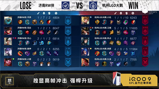 第四局开局杭州LGD大鹅对抗路、发育路换线。1分57秒杭州LGD大鹅发育路击杀李元芳拿下一血。3分24秒杭州LGD大鹅拿下暴君。3分30秒对抗路团济南RW侠打出1换2。4分10秒杭州LGD大鹅中路下河道处击杀猪八戒。4分42秒杭州LGD大鹅摧毁敌方发育路外塔。4分59秒杭州LGD大鹅中路击杀盾山。6分20秒中路团双方打出1换1。7分钟杭州LGD大鹅拿下主宰。7分58秒杭州LGD大鹅摧毁敌方发育路二塔。8分11秒济南RW侠摧毁敌方对抗路外塔。9分17秒杭州LGD大鹅拿下暴君。9分40秒中路团双方1换1。10分15秒杭州LGD大鹅野区击杀镜。10分38秒杭州LGD大鹅拿下暗影主宰。11分10秒杭州LGD大鹅摧毁敌方对抗路二塔。11分37秒杭州LGD大鹅中路击杀盾山,随后摧毁敌方中路外塔。12分29秒杭州LGD大鹅拿下暗影暴君。12分47秒杭州LGD大鹅摧毁敌方中路二塔。13分01秒杭州LGD大鹅摧毁敌方对抗路高地塔,随后击杀盾山。13分30秒高地团杭州LGD大鹅打出0换3,马可波罗拿下三连决胜。13分50秒水晶处团战杭州LGD大鹅0换2团灭对手。13分58秒杭州LGD大鹅摧毁水晶拿下比赛。