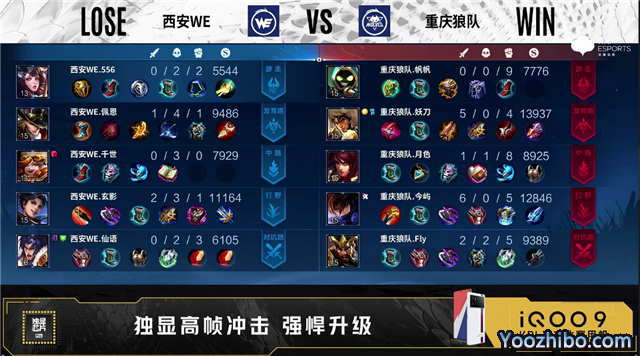 开局重庆狼队关羽入侵敌方蓝野区。3分26秒西安WE拿下暴君。3分59秒西安WE对抗路击杀关羽拿下一血。5分33秒西安WE摧毁敌方发育路外塔。5分36秒重庆狼队拿下先知主宰。5分51秒重庆狼队摧毁敌方对抗路外塔。6分25秒重庆狼队发育路击杀沈梦溪。8分01秒西安WE拿下暴君。8分46秒重庆狼队摧毁敌方发育路外塔。9分13秒重庆狼队野区击杀马可波罗。10分钟重庆狼队摧毁敌方中路外塔。10分29秒重庆狼队拿下暗影暴君。11分09秒重庆狼队拿下暗影主宰。11分37秒重庆狼队中路击杀沈梦溪。11分58秒野区团重庆狼队打出1换3。13分05秒重庆狼队野区0换2。13分38秒重庆狼队摧毁敌方中路二塔。14分07秒重庆狼队摧毁敌方发育路高地塔。14分43秒重庆狼队拿下暗影暴君。15分08秒暗影主宰处团战重庆狼队打出1换5团灭西安WE。15分51秒重庆狼队摧毁水晶拿下比赛。