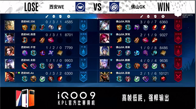 2分23秒,西安WE拿下暴君。3分20秒,佛山GK下路击杀狄仁杰拿下一血。5分10秒,中路团,佛山GK击杀张良。5分36秒,佛山GK下路击杀狄仁杰,随后破掉西安WE下一塔。5分58秒,西安WE拿下主宰。7分05秒,西安WE破掉佛山GK下一塔,随后拿下暴君。7分44秒,佛山GK中路击杀吕布。8分05秒,佛山GK破掉西安WE中一塔。10分14秒,佛山GK破掉西安WE上二塔。10分30秒,佛山GK拿下暴君,中路团,佛山GK打出0换3。11分钟,佛山GK破掉西安WE中二塔和中路高地塔。12分11秒,佛山GK拿下暗影主宰。13分02秒,佛山GK破掉西安WE下二塔。13分20秒,下路团,佛山GK打出2换4,随后破掉西安WE下路高地团。13分54秒,佛山GK击杀镜后摧毁水晶连下三城拿下本场比赛胜利。