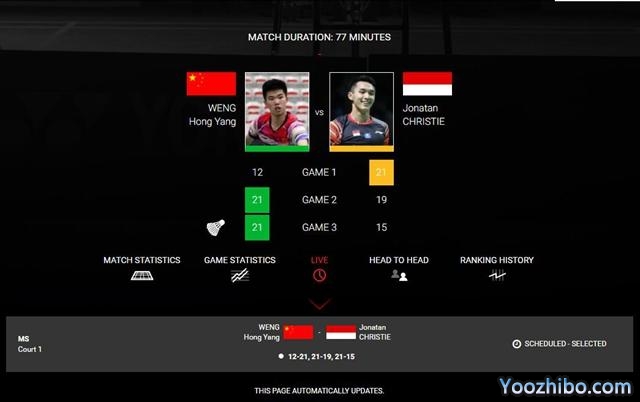 第一局,乔纳坦的表现更为出色,翁泓阳的进攻打不死对手,得分手段显得太单一,相比较而言,经验老道的乔纳坦得分手段更丰富,防守也更加出色,21-12,乔纳坦先下一城。