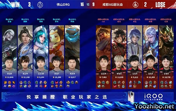 十分钟,佛山DRG击破中路一塔,成都AG找到机会集火盾山将其击杀。十四分钟,鹏鹏赵怀真先手开团,百兽司空震成功切掉蒙犽。十六分钟佛山DRG推掉对方所有外塔,在下路双方打出三换三。十八分半,佛山DRG青枫 王昭君关键抢夺暗影暴君,佛山DRG继续追击,一波团灭对方,直冲水晶获得比赛胜利。