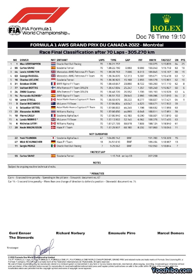 赛后,由于阿隆索在防守博塔斯时多次变线,被赛会罚时5秒,掉到第9位,博塔斯递补升至第7,周冠宇升至第8,刷新了正赛最佳完赛纪录。
