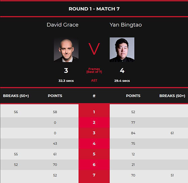 颜丙涛和大卫·格雷斯在此前的北爱尔兰公开赛上就有过交手,当时颜丙涛以2-5落败。本次比赛,大卫·格雷斯打出了单杆50+先胜一局,颜丙涛在丢掉首局的情况下重新振作,连赢3局,总比分3-1率先拿到赛点,不过在第五局颜丙涛出现失误,大卫·格雷斯轰出了单杆55分拿下,第六局,格雷斯又打出了单杆52分将总比分追平。决胜局,两人的争夺已经进入了白热化阶段,颜丙涛通过多次上手,以70-52拿下,从而以4-3险胜对手晋级下一轮。
