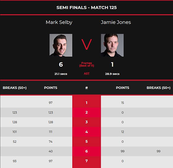 第六局,在连输五局并被拿到赛点之后,琼斯终于有所斩获,他的单杆90分挽救一个赛点,比分追成5-1。第七局,塞尔比再也没有给对手机会,开局率先上手得分,断掉之后对手没有得分,塞尔比再度上手夺冠93分制胜,总比分6-1强势晋级。