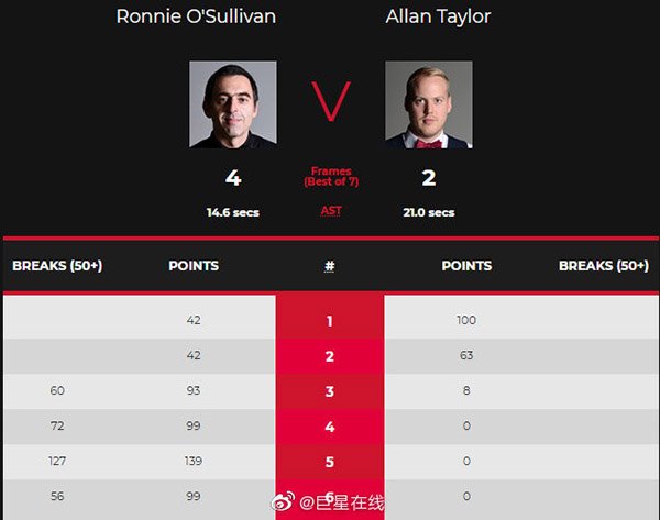 找到感觉的奥沙利文开始反击,他连续轰出两杆60+,瞬间追成2平。第五局,奥沙利文打出一杆127分,全面压制艾伦·泰勒。第六局,奥沙利文两次上手,一杆56分锁定胜局。在0-2落后的情况下,奥沙利文打出一杆破百、三杆50+,最后三局全部零封艾伦·泰勒,最终以4-2获胜,晋级64强。