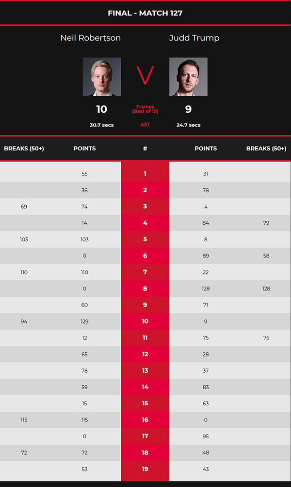 决胜局中,特鲁姆普安全球大漏,罗伯逊简单中袋上手,在拿到20+后,他面对一颗可能决定胜负的难度粉球陷入四分钟长考,随后放弃不打、转入防守。安全球大战质量奇高,罗伯逊几次做出精妙的防守均被化解,此后二人各有一次上手均未能一杆制胜,此后罗伯逊在围绕黄球的防守中出现重大失误,特鲁姆普打进并利用绿球做出高质量防守,从而再度上手,却在击打粉球时出现低级失误,罗伯逊10-9获胜!