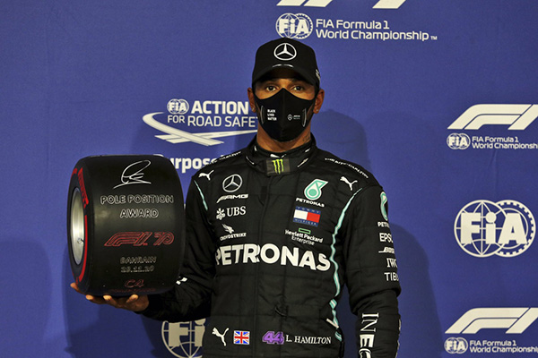 北京时间11月28日,2020赛季F1锦标赛来到巴林,举行赛季第15站的争夺,在巴林大奖赛的排位赛中,汉密尔顿两度刷新赛道纪录,以1分27秒272摘下杆位,队友博塔斯位列第2位,梅赛德斯车队又一次包揽发车头牌,红牛车手维斯塔潘位列第3,阿尔本、佩雷兹、里卡多排在4-6位,法拉利双雄维特尔、勒克莱尔分别排在第11、12位。