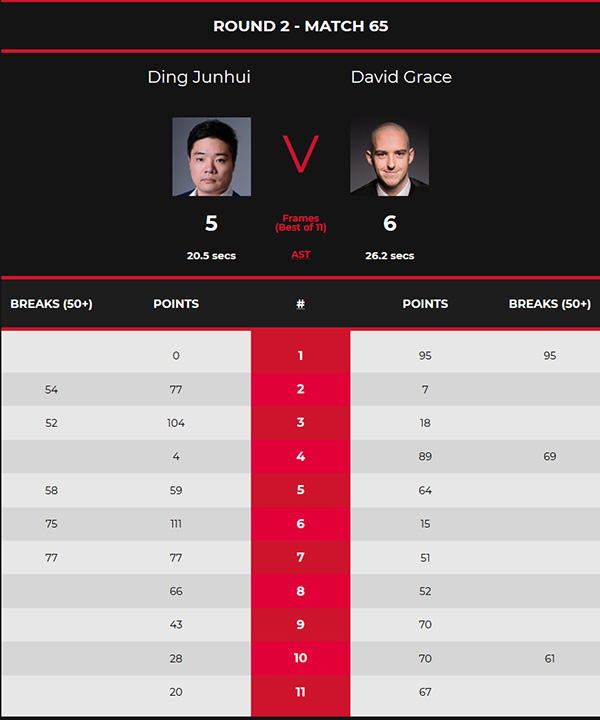 第四局格雷斯一杆得到69分,以89-4拿下追至2-2进入中场休息。