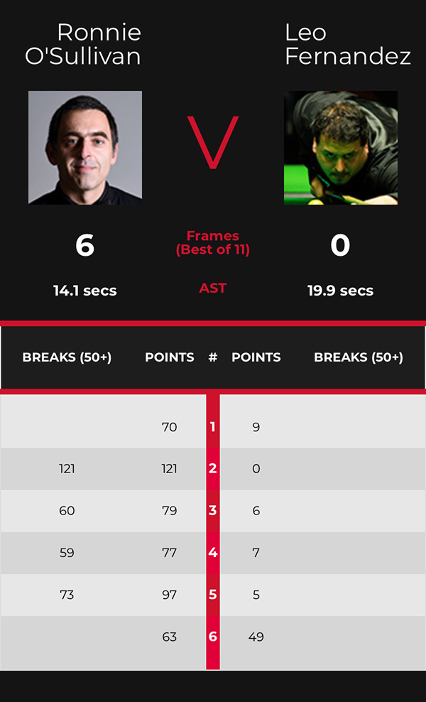 英锦赛七冠王奥沙利文,首轮迎战爱尔兰的费尔南德兹,这也是两人首次交手。首局奥沙利文几次上手,以70-9先声夺人。第二局奥沙利文找到手感,一杆破百得到121分,零封2-0领先。第三局奥沙利文继续控制局面,单杆60分以79-6胜出3-0。第四局奥沙利文一杆拿下59分,以77-7获胜4-0结束上半场。下半场第五局,奥沙利文一杆73分以97-5获胜,5-0拿到赛点。第六局双方几经胶着,奥沙利文把握住彩球机会,以63-49获胜总比分6-0横扫晋级
