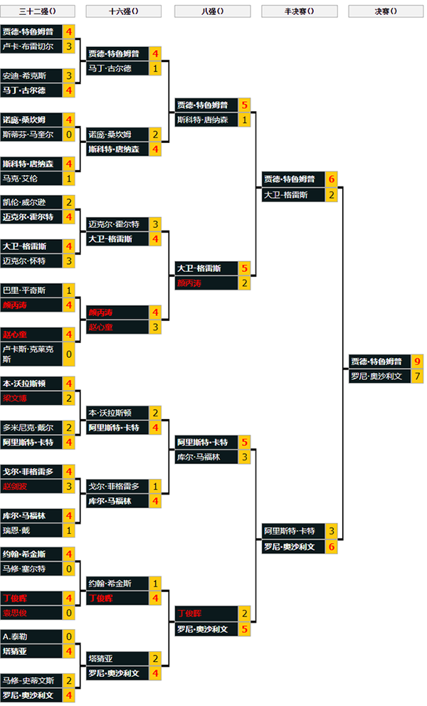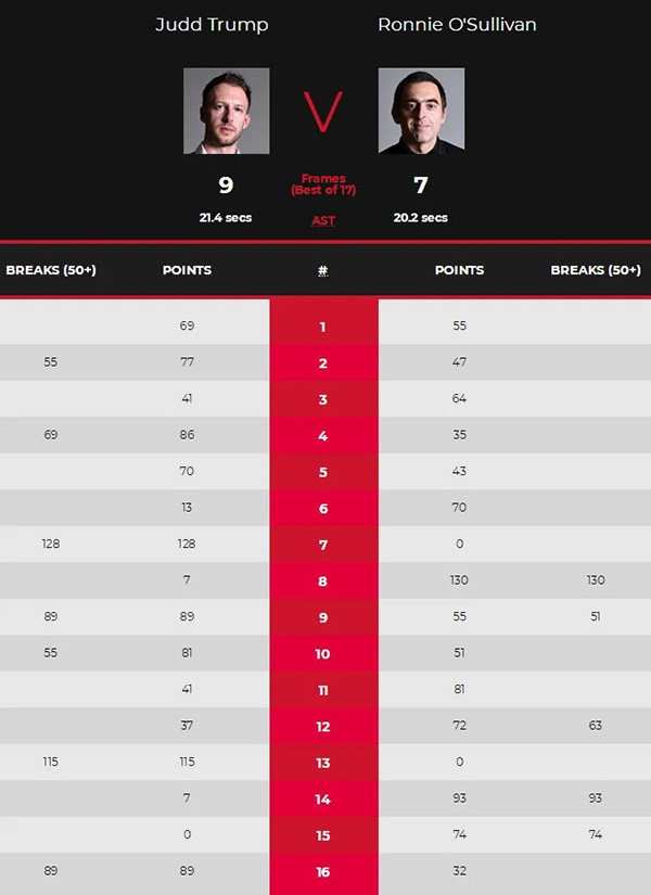 第13局中特鲁姆普上手打出单杆115分本场第二杆破百,总分8-5率先来到赛点,第14局中奥沙利文打出单杆93分挽救赛点,第15局又打出单杆74分制胜,连救两个赛点总分7-8落后一局。第16局中,奥沙利文有机会将比赛带入到决胜局,围球连得32分后打丢中袋进攻,特鲁姆普随后一杆89分制胜,总分9-7击败奥沙利文夺得冠军奖杯。