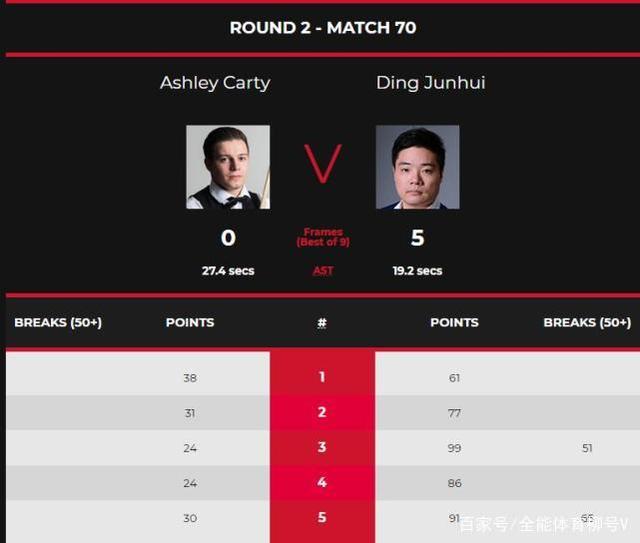 第二局,丁俊晖在拿到58分后中断进攻,虽然对手在局末顽强追分,但丁俊晖还是以77-31再胜一局,取得2-0领先。第三局,两人依旧是失误非常多,丁俊晖在拿到48分后,进攻红球打薄,送给对手上手机会,但是对手没能抓住机会,丁俊晖99-24拿下,取得3-0领先。