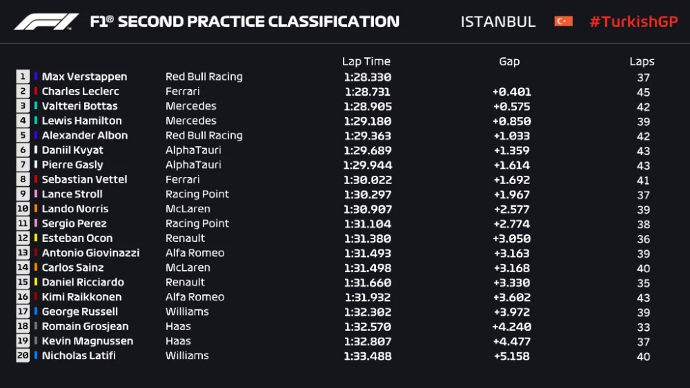[腾讯] 2020F1土耳其大奖赛第二次练习赛 数据