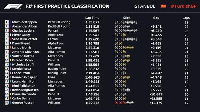F1土耳其大奖赛第一练习赛成绩表:
