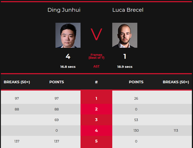 第5局比赛中,布雷切尔防守端失误不断,开球后安全球打球堆力量太大直接漏长台,丁俊晖拼进长台后上手围球,这杆进攻丁俊晖继续保持着本场的好手感,围球打出单杆137分清台胜出,总分4-1丁俊晖六连胜布雷切尔,强势挺进英格兰赛32强。