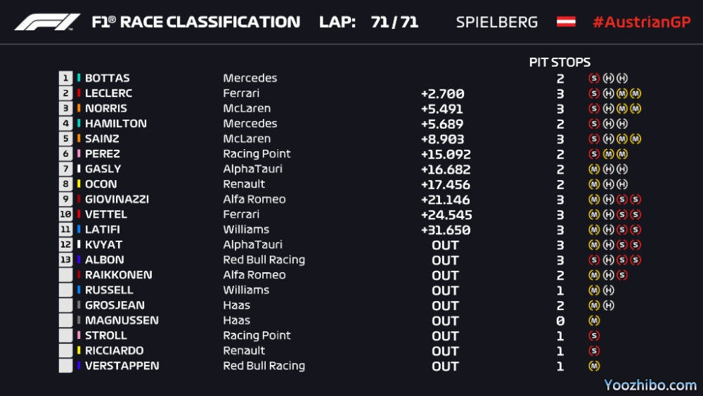 北京时间7月5日消息,2020赛季F1揭幕站奥地利大奖赛结束了正赛的争夺。杆位出发的博塔斯一路领先,最终如愿获得揭幕站的胜利,被罚从第五位起步的汉密尔顿第二位冲过终点,但是又因为与阿尔本的碰撞被罚时5秒,勒克莱尔因此获得亚军。汉密尔顿只获得第四名。