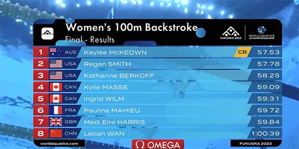 中国小将万乐天出战女子100米仰泳决赛,最终,万乐天排在第8名,凯莉-麦基翁以57秒53创造新的世界纪录夺冠。万乐天最近2年进步非常大,已经成为中国游泳队主力运动员之一。2021年9月,万乐天获得第十届全运会女子100米仰泳银牌。早在2018年,体育总局就授予万乐天“运动健将”的称号,而在2022年4月,万乐天还以优秀运动员的身份保送本科生。