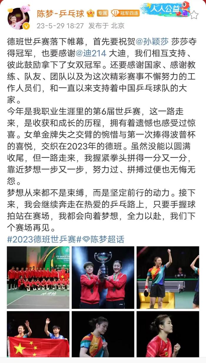 陈梦还能圆梦大满贯吗?在丢冠,无缘大满贯后,在谈到自己的未来的时候,陈梦用了一句话回应了过去的种种,陈梦表示“梦想从来都不是束缚。”