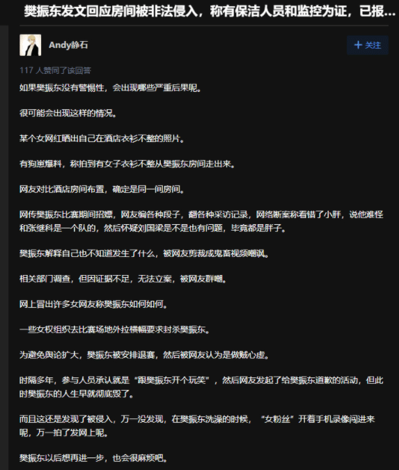 甚至如果樊振东警惕性不高,这名女粉丝躲在房间的角落不被发现,等樊振东洗澡或者宽衣的时候出来拍照,然后发布在网络上,可想而知对于樊振东的影响会有多名恶劣,可以说细思极恐。