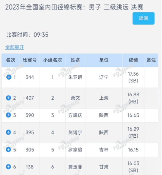 24直播网03月16日讯全国室内田径锦标赛继续进行,男子三级跳远落下帷幕,最终辽宁选手朱亚明第三跳17米36,成功夺得冠军。这位东京奥运会银牌、世锦赛铜牌获得者表现强势,创造PB。亚军属于来自上海的粟文,他跳出了16米88,也创个人PB。第三名属于陕西的方耀庆,他的成绩是16米65。