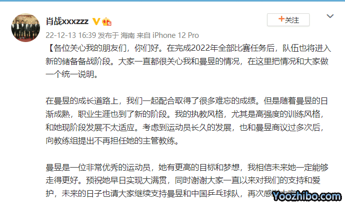12月13日17时,肖战指导在社交媒体上宣布,自己不再担任王曼昱的教练。至于原因呢?肖战指导表示自己高强度的训练风格已经不适合现阶段的王曼昱,所以在和王曼昱进行了多次协商之后,向教练组提出不再担任她的主管教练。