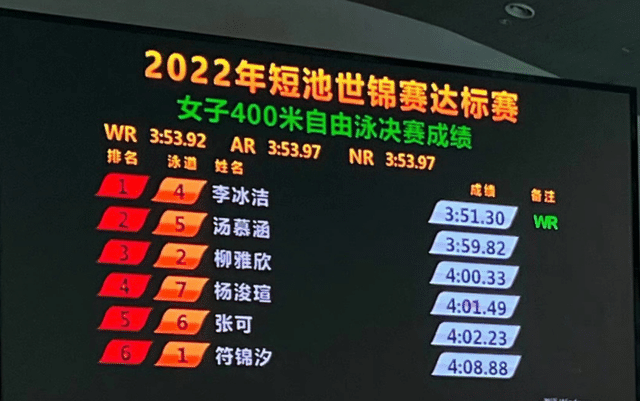 本次世锦赛选拔赛的成绩,在第一天结束后,便引爆了体育圈。李冰洁在女子400米自由泳项目上,一举打破蒂特姆斯保持的短池世界纪录。李冰洁赛后也非常激动,在社交媒体上发布感言,表示低迷彷徨泪水伤病都没有白费。著名游泳杂志swimswam也盛赞李冰洁的给所有人带来了惊喜。
