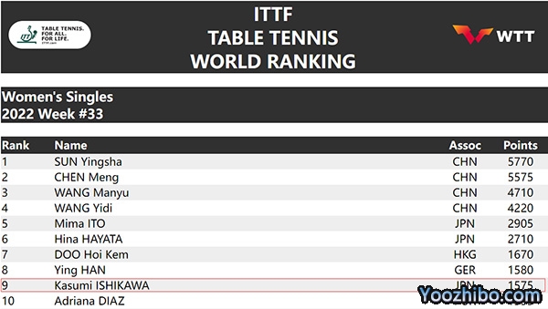 根据2022年8月15日国际乒联发布的最新的第33周女单排名中,石川佳纯以1575积分排名第9。