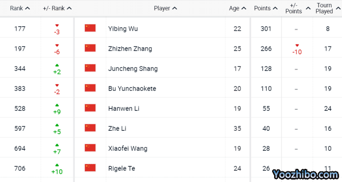 中国男子选手,虽然吴易昺和张之臻的世界排名都略有下滑,但两人依然还是稳定在前200。吴易昺排名第177位,而张之臻则排名第197位。两人都已经锁定美网资格赛。在美网开始之前,两人将继续征战比赛,争取获得更高的积分。年仅17岁的商骏程则排名第344位。
