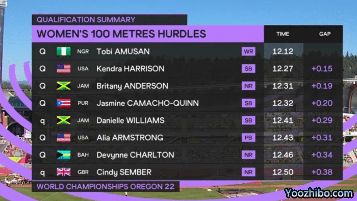 女子100米栏项目处于群雄逐鹿的状态,在本赛季世锦赛之前,一共有3名选手跑进12秒40,10名选手跑进12秒50。世界纪录12秒20归属于美国名将哈里森,这位30岁的老将在不久前的全美锦标赛上再度获得冠军。而波多黎各选手奎茵在奥运会上跑出过12秒26,她也拿到了去年东京奥运会的金牌。