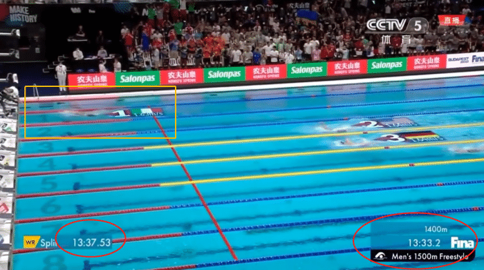 而这场比赛还有一个悬念,帕特里尼耶里在前1400米,都压着世界纪录的红线。而世界纪录保持者,就是中国选手孙杨。孙杨在2012年伦敦奥运会,创造14分31秒02的新世界纪录夺得奥运金牌。1400米转身过后,帕特里尼耶里依然领先世界纪录超过一个身位。但最后100米,世界纪录红线开始疯狂加速。