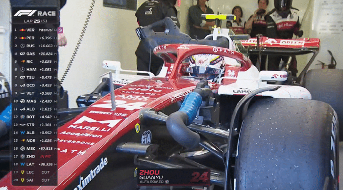 可惜的是周冠宇退赛,他的Radio:“引擎有故障,得退赛了”