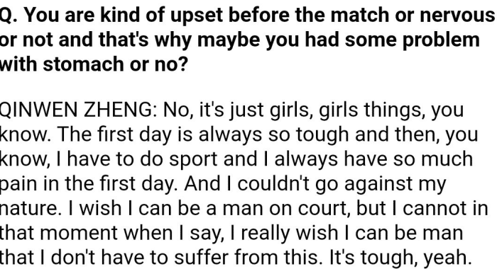 赛后的新闻发布会上,郑钦文道出了实情。她表示:“腿部伤势的确很艰难,但比起肚子疼还算好。今天非常难受,肚子疼是最让我无法正常发挥的,但我拼尽了全力。”在记者的追问之下,郑钦文表示:“肚子疼是女孩子的问题,第一天总是很难受,但你必须上场打球。我无法改变生理期,我真想自己是个男人,这样就不用受这罪了。”