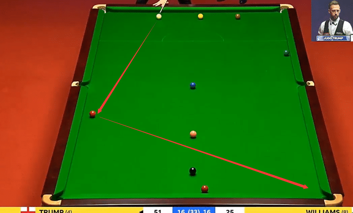 特鲁姆普此时选择用十字回球的方式,连攻带防进行翻袋尝试。而这球,特鲁姆普也成功翻袋得手。接着,特鲁姆普选择防守,不过质量不高。马克威廉姆斯也防守一杆,接着特鲁姆普故伎重施,再度选择十字回球,红球再度翻袋命中!这一次,特鲁姆普没有再浪费机会,打进咖啡球并准确校位找到红球。随后,特鲁姆普打进最后一颗红球,完成超分,从而17-16击败对手。