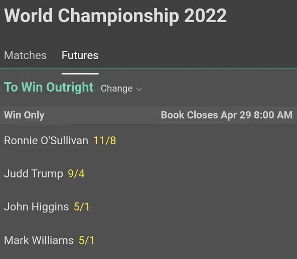 24直播网04月28日讯 斯诺克世锦赛4强出炉,相关机构也随之更新了夺冠赔率。赔率显示,奥沙利文继续高居榜首,特鲁姆普排名第2,希金斯和马克·威廉姆斯并列第3位。而且从数据来看,奥沙利文的领先优势很大,非常有可能拿到世锦赛第7冠,从而追平亨德利的历史纪录。