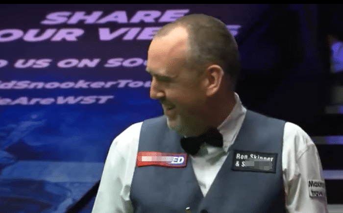 由于球形太过复杂,这一局双方鏖战很长时间。当颜丙涛又一次做出防守,看台上的观众大喊:Come on 颜,我需要上厕所。来到球台准备击球的马克威廉姆斯显然也有些憋不住了,转头对观众说:我也是。最终,颜丙涛没有意外的拿下这一局,将比分扳成7平。