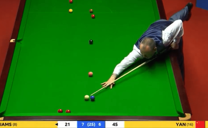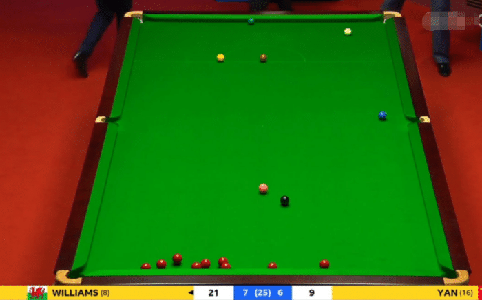 第二阶段,颜丙涛一度打出了连胜4局的攻势。尤其双方的第14局,堪称第二阶段的缩影。从上一张图就可以看出,颜丙涛的策略到底会让擅长进攻的马克威廉姆斯多么难受。所有的红球都被停到了球台的下方,这样的局面对于马克威廉姆斯堪称灾难,而对于颜丙涛小磨王来说不在话下。