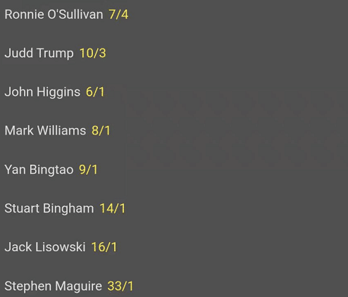 24直播网04月26日讯 ,斯诺克世锦赛8强全部出炉,随之相关机构也更新了最新的夺冠赔率。奥沙利文登上榜首,特鲁姆普排名第2,希金斯排名第3,马克威廉姆斯第4,中国选手颜丙涛高居第5,而他在8名选手中世界排名倒数第二。宾汉姆、利索夫斯基和马奎尔分列6-8位。